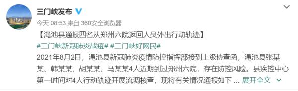 央视网消息:据“三门峡发布”微博发布的消息,8月2日,三门峡渑池县新冠肺炎疫情防控指挥部接到上级协查函,渑池县张某某、韩某某、胡某某、马某某4人近期到过郑州六院,存在防控风险。渑池县疾控中心第一时间对4人行动轨迹开展流调核查,现将有关情况通报如下: