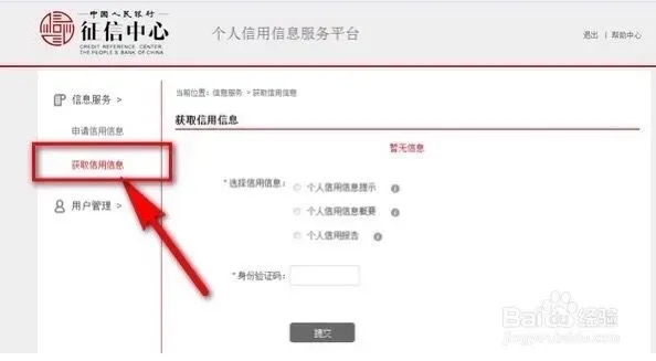 第五步:提交个人信用报告查询申请后的24小时内,您的手机将会收到身份验证码,登录平台,点击“信息服务”模块下的“获取查询结果”,按提示输入身份验证码,即可成功的查看自己的信用报告。