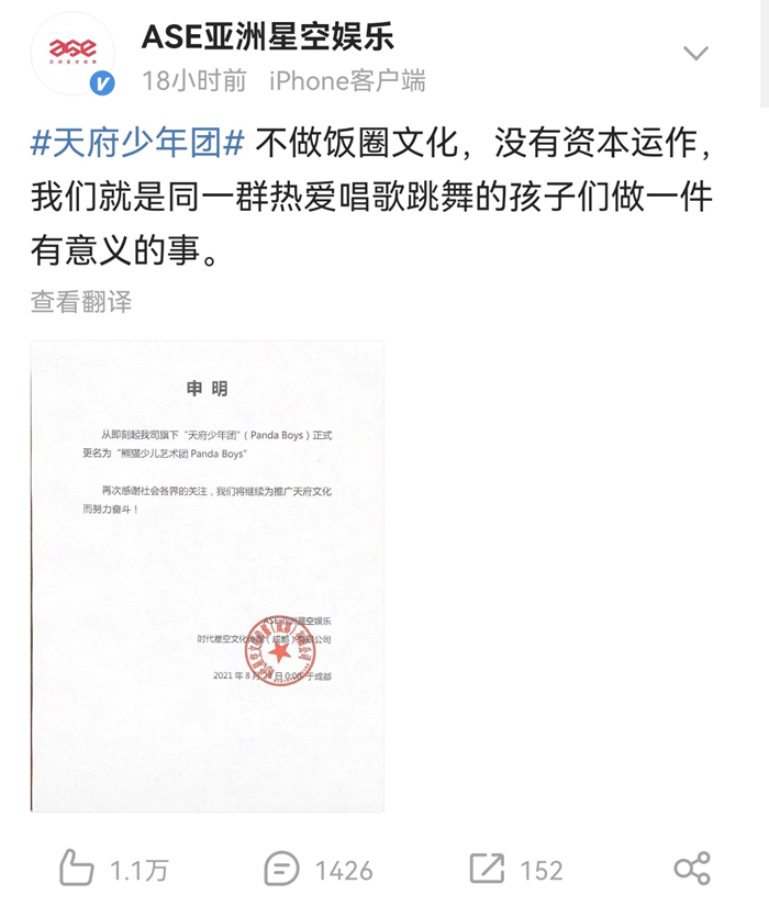 24日凌晨,公司再次回应,不做饭圈文化,没有资本运作,并将“天府少年团”(Panda Boys)更名为“熊猫少儿艺术团 Panda Boys”。