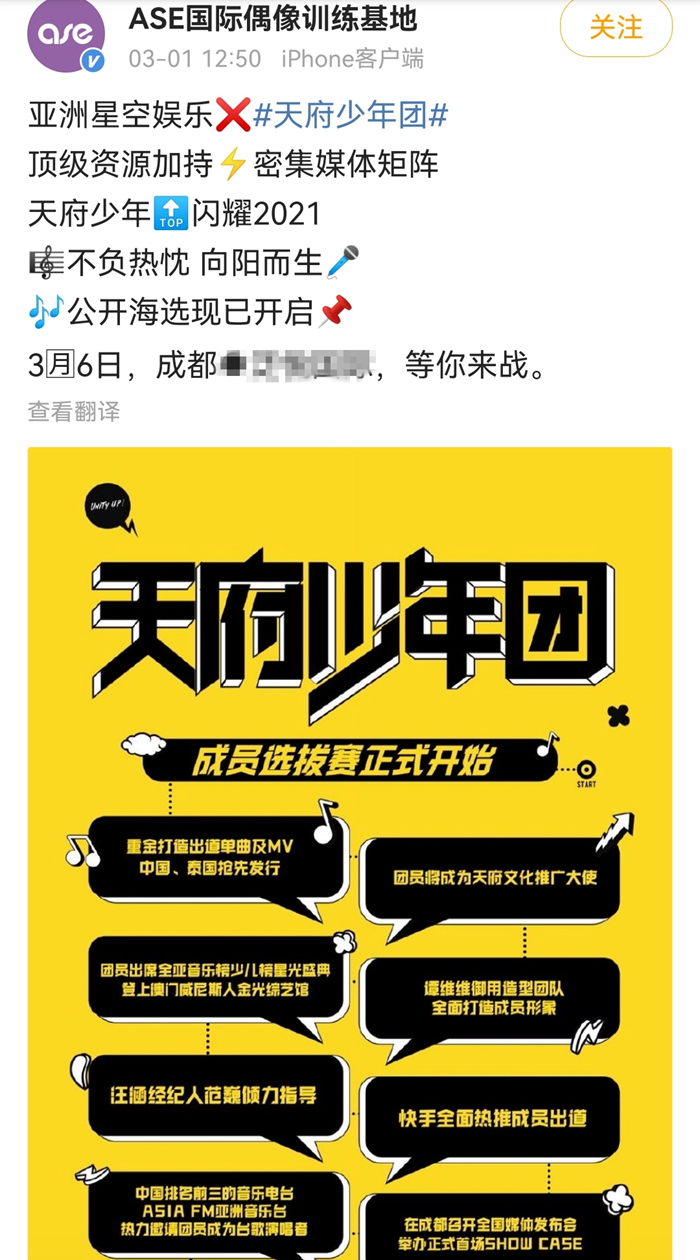 翻阅这家经纪公司的微博,一篇《ASE偶像产业2021牛劲十足》的文章曾写道:ASE国际偶像训练基地中国首站落户成都,以首个出道偶像团体“天府少年团”拉开ASE在中国的偶像产业序幕……
