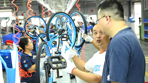 在广东佛山,哈啰OEM整车供应商佛山金川科力远的生产线上,工作人员正在展示共享单车的生产流程