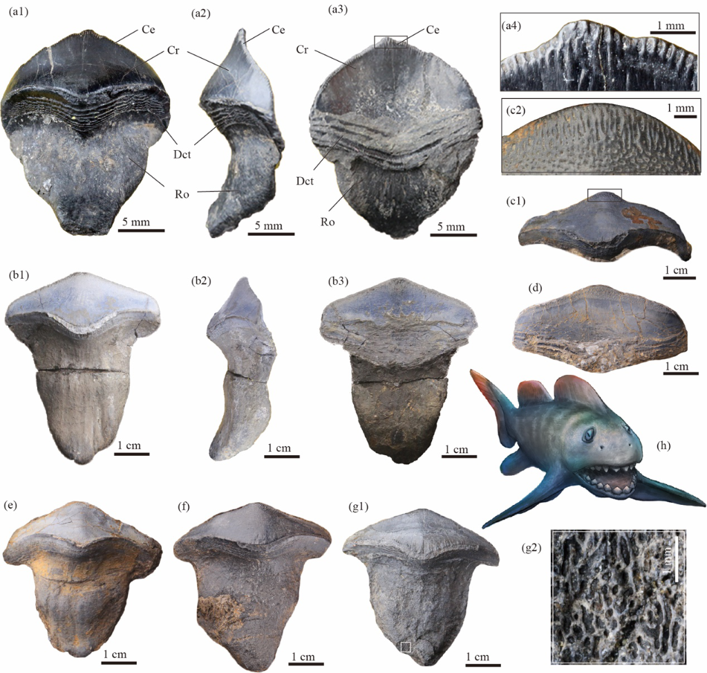 在几亿年前的海洋里,瓣齿鲨究竟是怎样生活和捕食的呢?林翔鸿介绍,传统观点认为,它们是一种底栖的运动缓慢的食壳鱼类,以底栖的腕足类、双壳类等具壳生物为食。但此次研究发现,环绕在瓣齿鲨齿冠基部的水平叠瓦状脊纹条带,可能具有在牙齿刺穿肌肉软组织时,通过增加摩擦来防止猎物逃脱的功能。