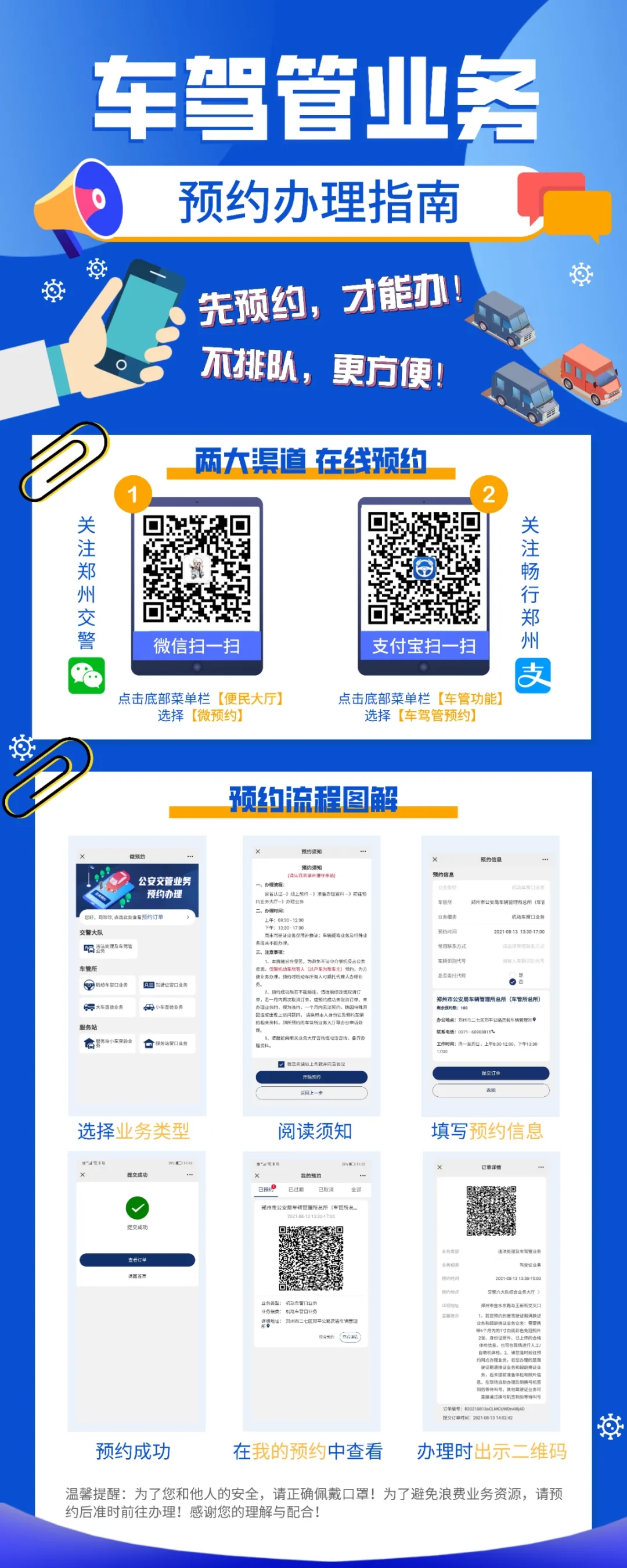 郑州交警微信公众号和支付宝畅行郑州平台进行预约