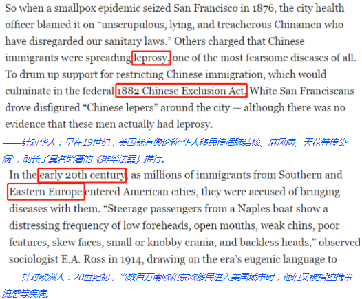 正如纳塔利娅·莫利纳所说,美国政客每逢危机便诿罪于人的甩锅恶习由来已久。宾夕法尼亚大学教授乔纳森·齐默曼近日在《华盛顿邮报》网站刊文指出,怪罪外人是美国抗击流行病史上的一个惯用手段。每当遇到流行病疫情,美国总会将其与外国人或者外来移民联系起来。