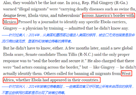 得州州长格雷格·阿博特7月在接受福克斯新闻采访时表示,拜登政府“允许感染新冠病毒可能性高的人免费进入美国,然后在我们的社区传播新冠病毒”。但大多数医生和公共卫生专家表示,几乎没有证据支持这一说法,移民并不比其他人群病得更严重,政客把重点放在移民身上是转移视线。美国南加州大学教授纳塔利娅·莫利纳在接受NPR采访时说,责怪移民、实行“医学种族主义”的做法在美国有很长历史。