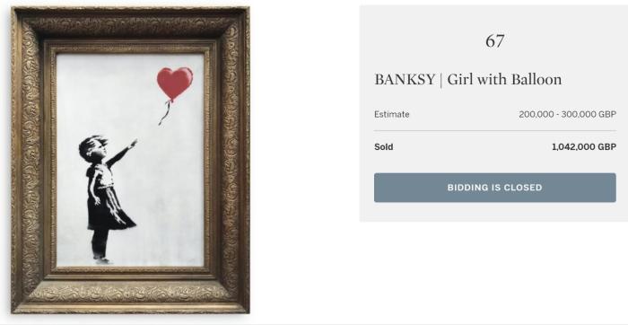 报道显示,当时买下这幅涂鸦的女收藏家来自欧洲,是苏富比拍卖行的长期客户。她表示,在《女孩与气球》的拍卖现场,拍卖槌落下,画作随即“自毁”,看到这一幕,她起初非常震惊,但她之后意识到,“我会得到属于我自己的艺术历史”。
