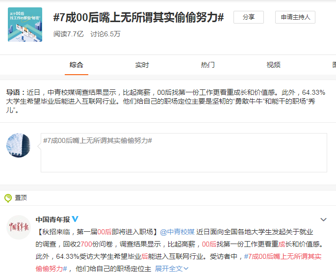 华北水利水电大学管理与经济学院老师、博士邢毅表示,身边的00后是事业心比较强的一代人,从他们在校读书时就有所体现。他们的目标非常明确,基本大一下学期就会初步明确毕业时要争取保研、考研,还是找工作,然后一步步地向目标努力。