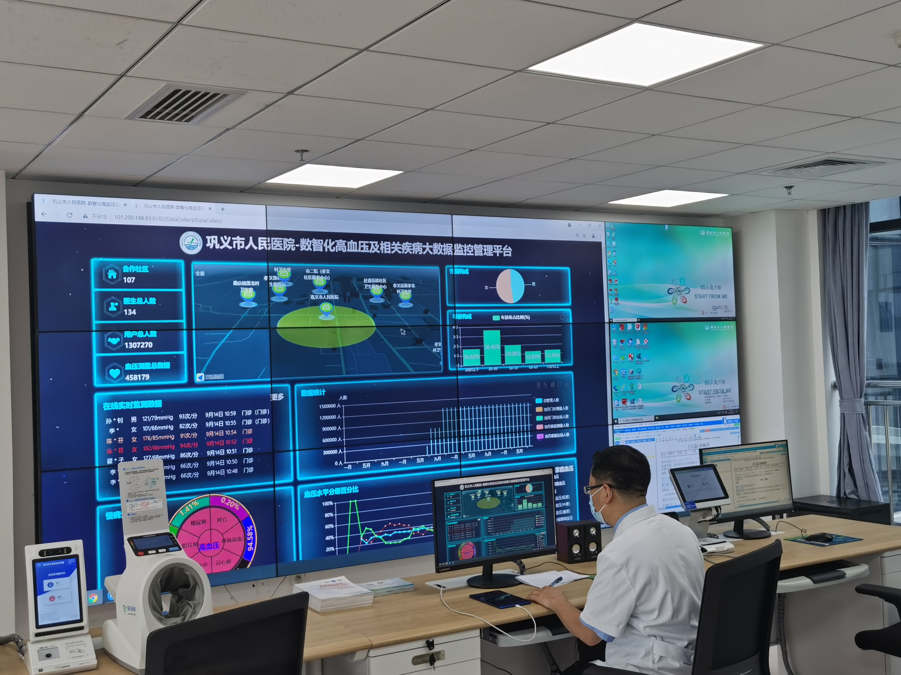 目前,巩义市人民医院慢性病科、高血压科、内分泌科融合心电、血糖、远程会诊等中心成立了医共体健康管理服务中心。在每个卫生院建设健康小屋,卫生室设置健康角,投放远程血压及心电设施200余台,通过采集动态数据,检测结果实时上传医共体健康服务中心,对患者病情进行科学评估、研判,并实行分级管理,完善慢病病人健康档案数据库。