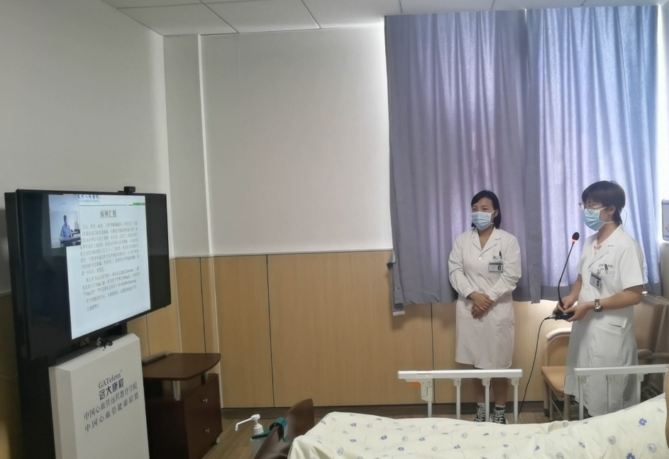 △岑雪玮正通过LED大屏与阜外华中心血管病医院医生连线