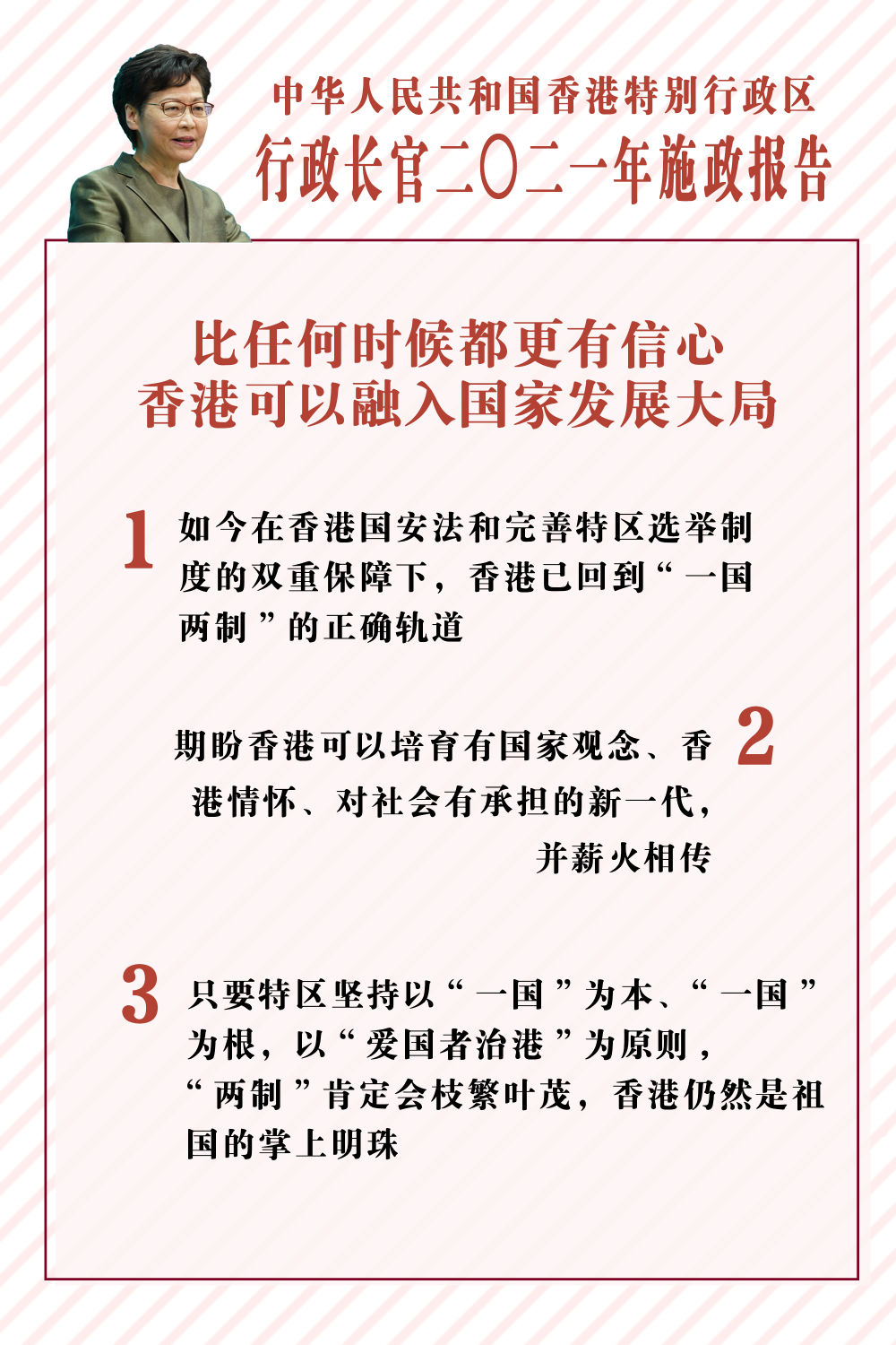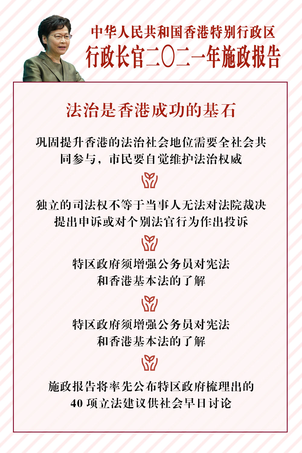 施政报告表示,香港特区须不断完善“一国两制”制度体系,正本清源,拨乱反正。