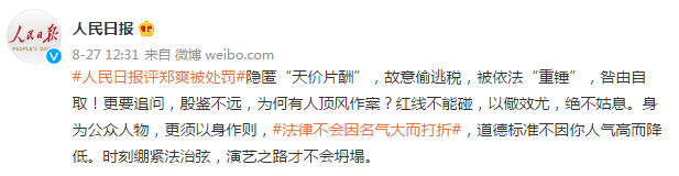 8月27日,郑爽在微博发布致歉信,对偷税漏税的行为道歉,接受行政处罚,并承诺按时补缴税款、缴纳罚款。