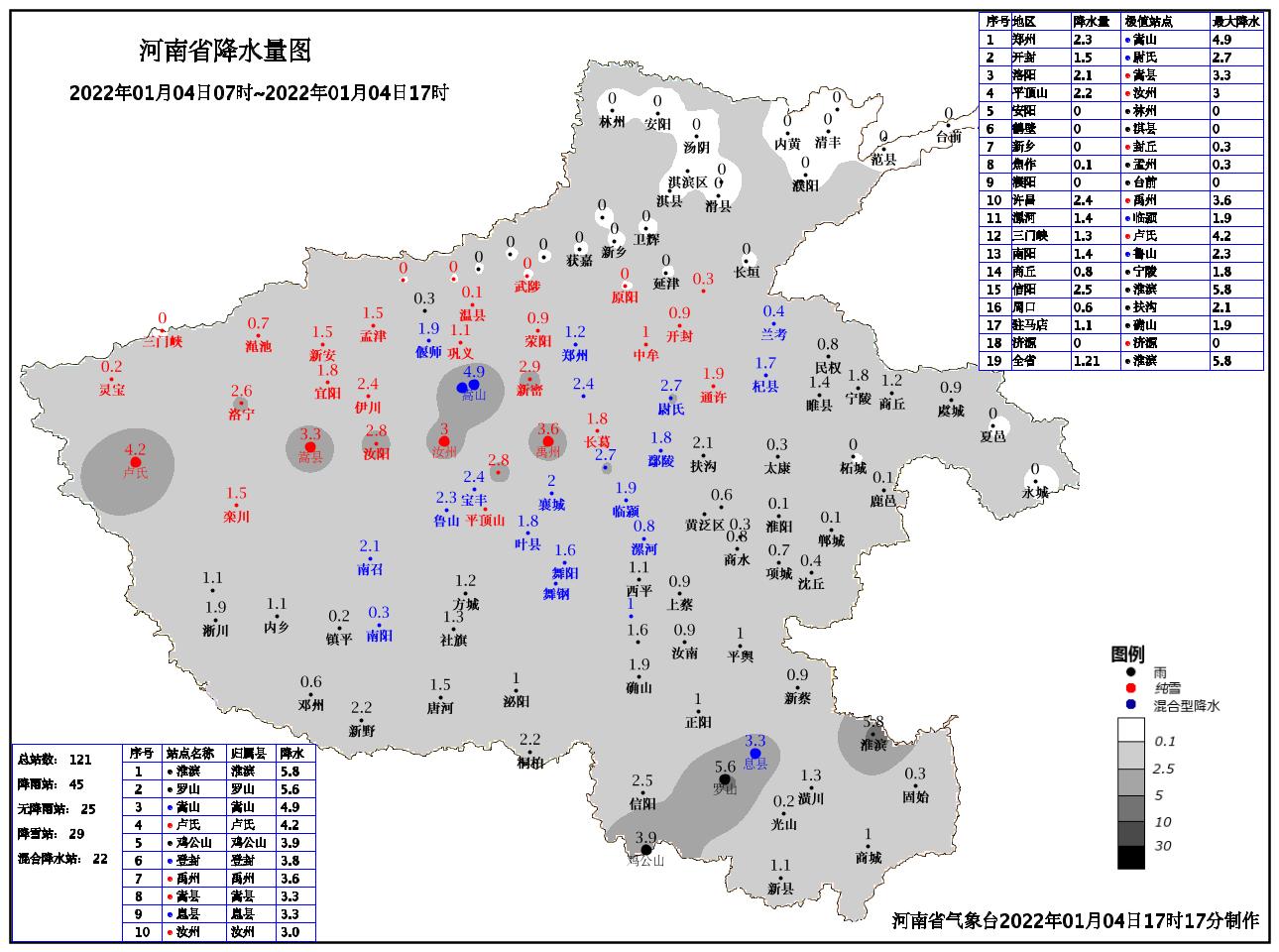 据河南省气象台统计数据显示,4日7时至17时,河南沿黄及其以南地区出现小雨雪天气,其中郑州、许昌、开封、洛阳、三门峡、平顶山、漯河等地出现雨夹雪或小雪,部分地区中雪,最大降雪量为卢氏4.2毫米,郑州相态由雨夹雪转纯雪,降水量为1.2毫米。