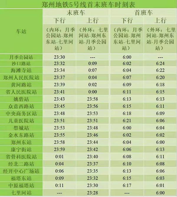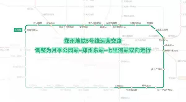 此外,地铁5号线运营交路调整为月季公园站~郑州东站~七里河站双向运行,其中工作日高峰期,月季公园站的行车间隔为15分钟,其余5号线车站为5~6分钟。首末班车时间根据运营范围有所调整。