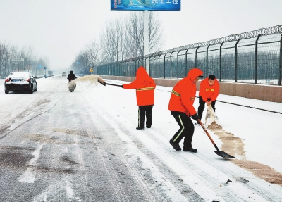 1月21日,宝丰县交通运输局道路维护工人在宝石快速路清理积雪。何五昌 高磊 摄