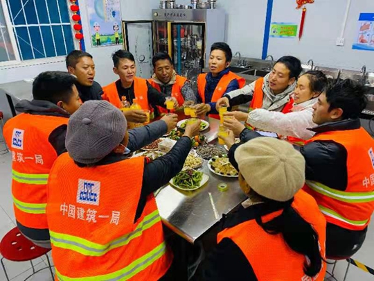 除夕当天,工友们早早来到项目食堂,有的张贴福字布置场地,有的包饺子,有的准备拿手菜。随着一盘盘风味不同的家乡菜端上桌,大家围坐在一起,共同举杯喜迎虎年春节。