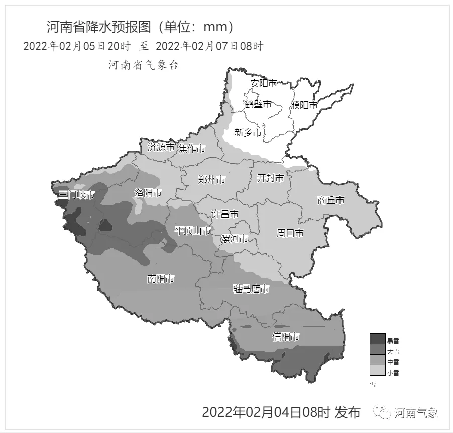 据河南省气象台天气预报称,受冷空气和高原低槽东移影响,预计5日傍晚至6日河南省黄河以南有一次小到中雪天气过程,其中三门峡、洛阳、信阳三地市南部和南阳北部的部分县市有大雪,降雪量达5~8毫米,山区局部10~14毫米;积雪深度3~5厘米,山区8~10厘米。7日至9日,信阳小雨雪天气维持,其它地市多云天气为主。