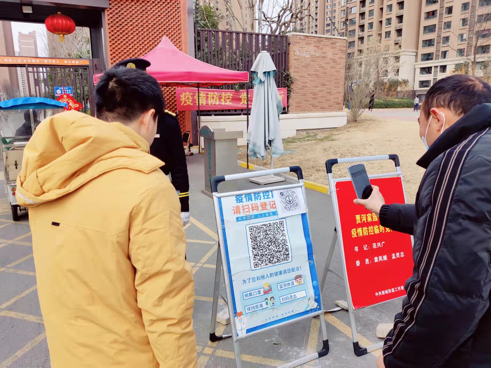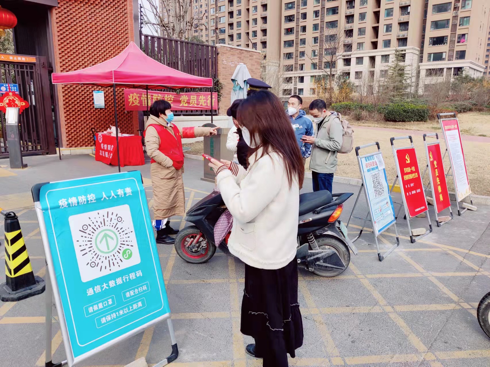 春节期间,走亲访友、返乡回城等人员流动巨大,防疫工作压力剧增,工作在一线的防疫工作人员更是不敢有一丝松懈。在正商贾河家小区各个出入口,村委工作人员、物业保安人员都在尽职尽责地对外来人员进行健康码检查、体温检查,并劝导大家戴好口罩等。
