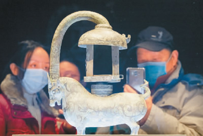 2月3日,观众在江苏南京博物院参观镇馆之宝——东汉错银铜牛灯。杜懿摄 (人民图片)