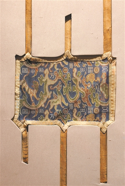 与之形成呼应的另一件重要文物是新疆维吾尔自治区博物馆珍藏的“五星出东方利中国”锦护膊。其中再次出现了“中国”二字,说明汉代人已对中国的方位和地位有了明确的指定。这件织锦护臂由当时最高级的五色经锦所织,锦为蓝色地,采用经线提花的织造方法制作,以宝蓝、绛红、草绿、明黄和白色等五组色经织出星纹、云纹、孔雀、仙鹤、辟邪和虎纹。以卷曲的植物蔓藤及两蕾一花作间隔,在花纹中间织出汉字隶书“五星出东方利中国”,“五”字后每隔三个字织有三色同心圆饰,表示金、木、水、火、土五星。