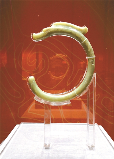 中国南方的良渚文化以盛行玉器而著称海内外,成为中华民族尚玉传统的源头之一,而来自北方红山文化的玉龙正好与之遥相呼应。故宫博物院收藏的这件新石器时期的玉龙是目前所见同类器中最大的一件,它的造型简约,充满了神秘感。这种由多种动物形象聚合并高度抽象而来的“龙”的形象,反映出先民思想观念的变革,是史前宗教祭祀发展到一定高度的产物,此后,龙的形象逐渐成为权力地位的象征。