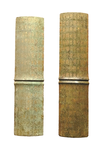 “节”是古代一种凭信物,相当于后来的文书。来自安徽博物馆的鄂君启金节令人惊艳。两件器物以竹节造型,青铜铸造,其上满饰错金篆书。稍短一件叫“车节”,相当于“陆路通行证”;稍长为“舟节”,相当于“水路通行证”。从铭文“为鄂君启之府商铸金节”可知,楚怀王为封君鄂君启专门铸造,供其经商之用。金节的出土说明在春秋战国时期,商业已经发展至较高水平。