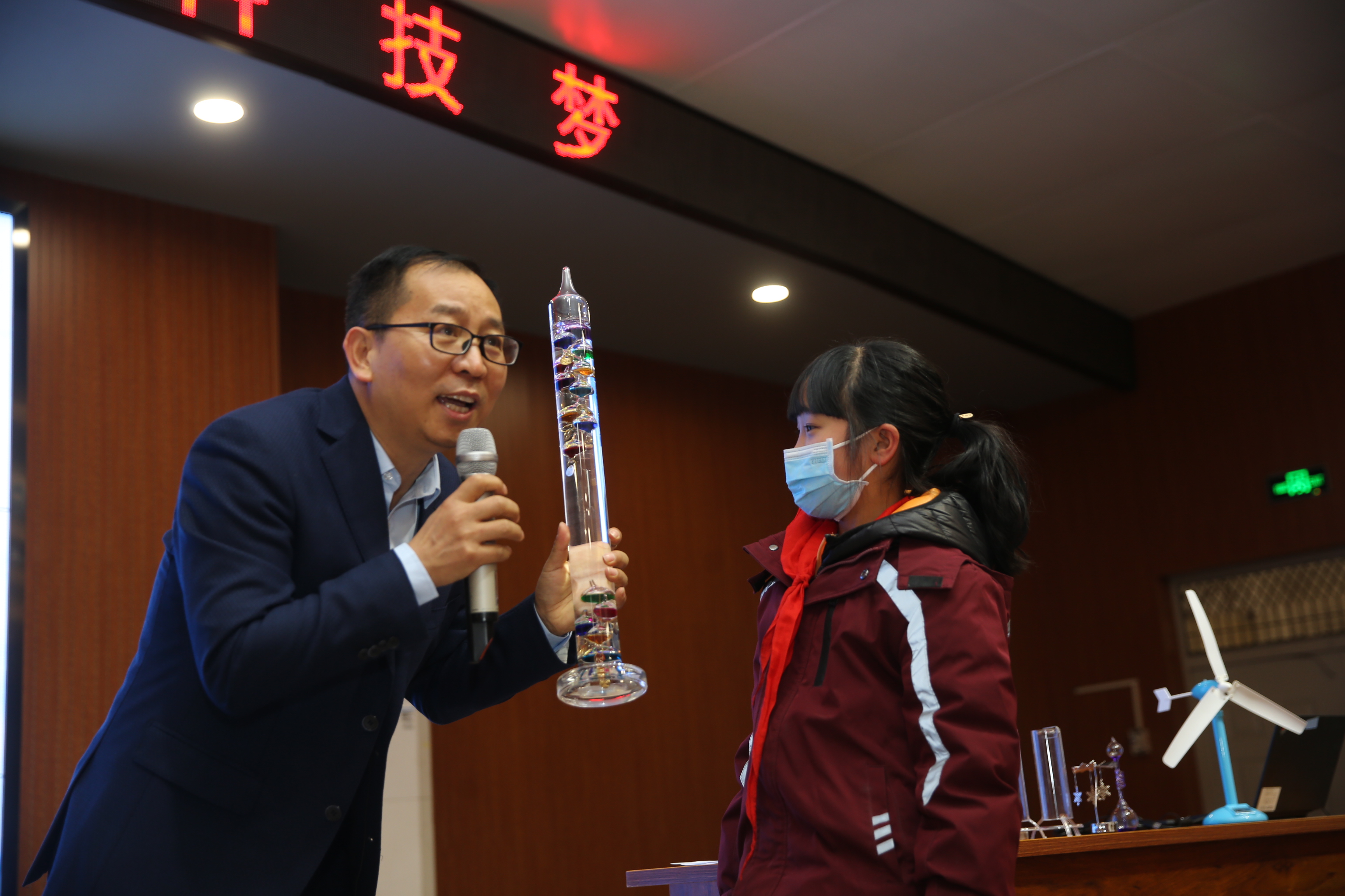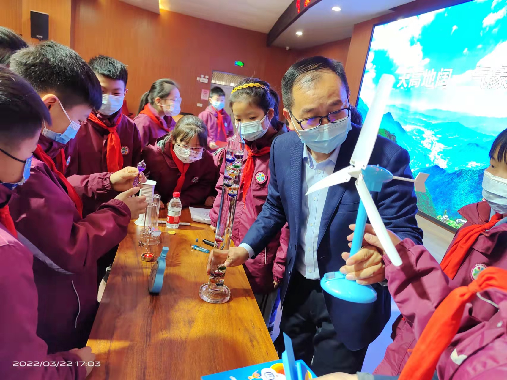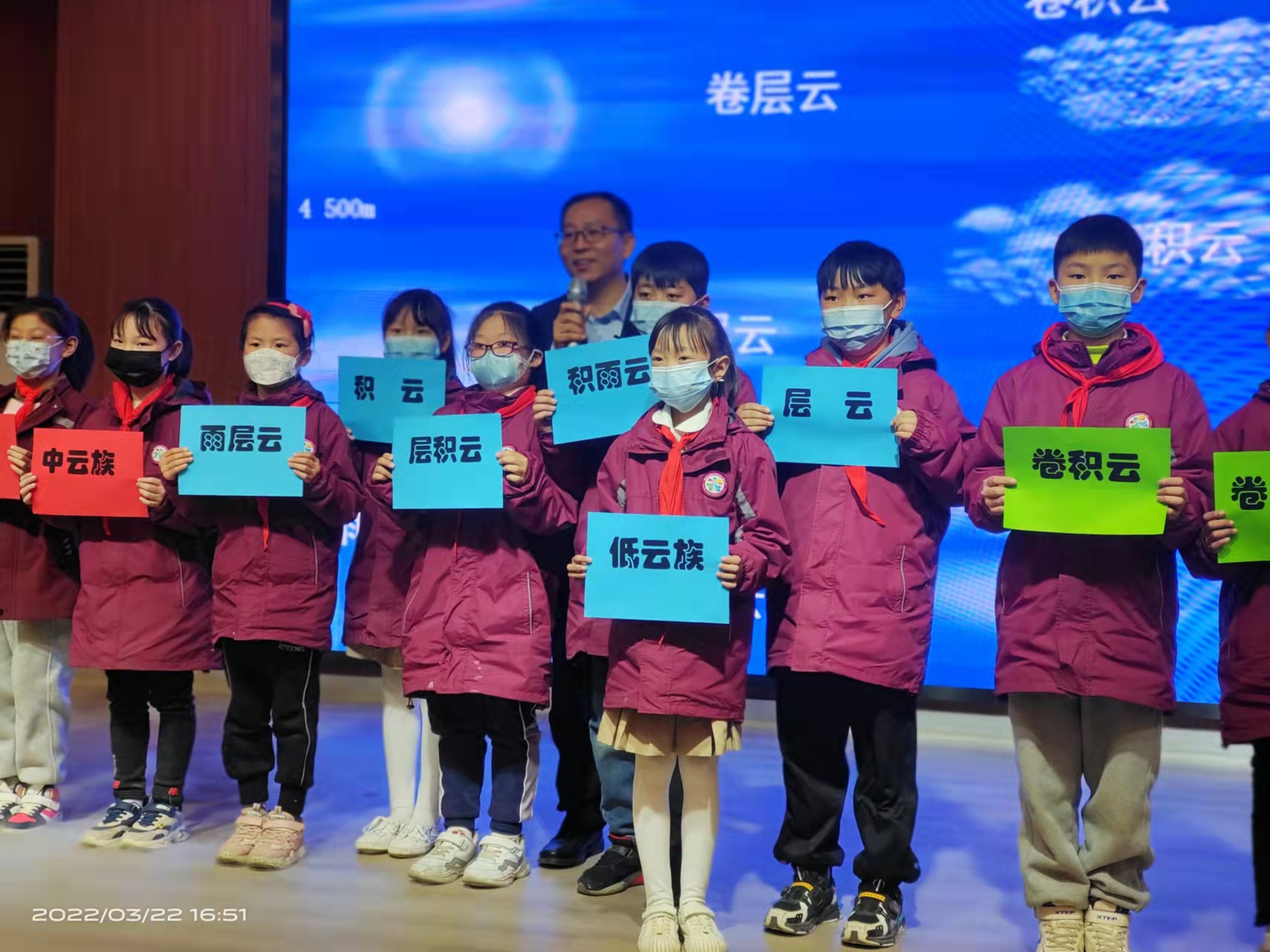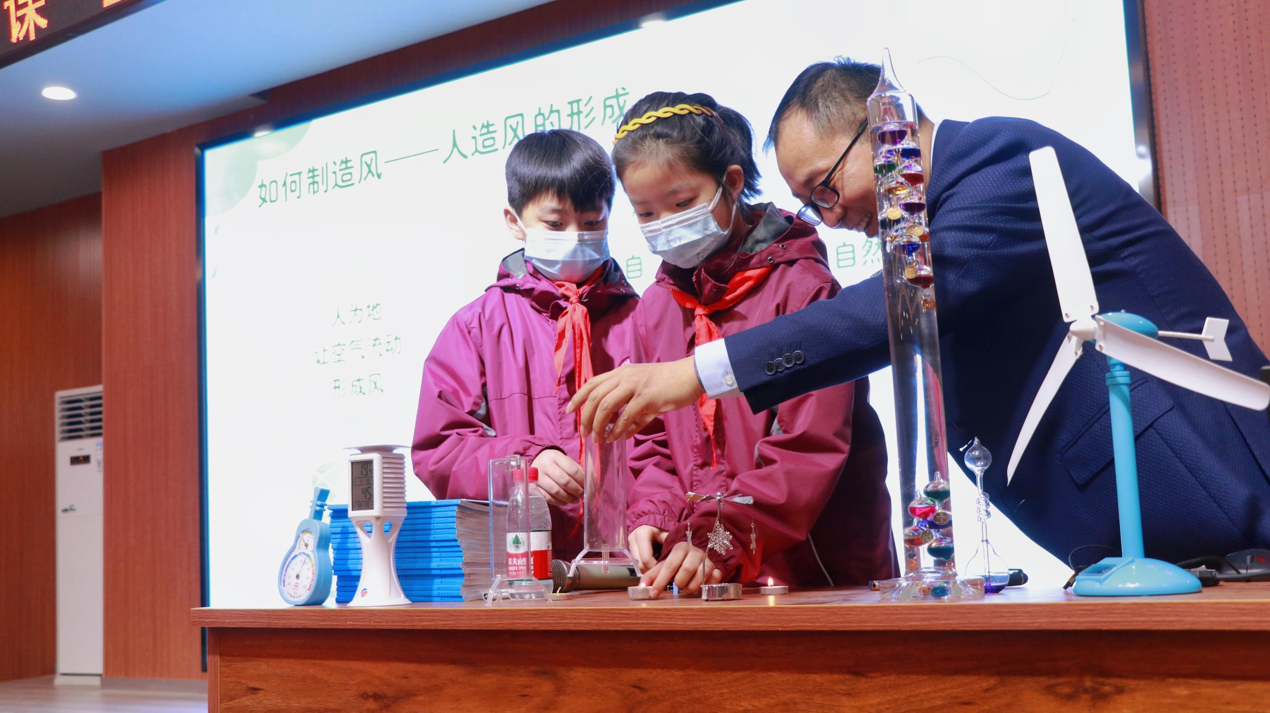 “什么是气象?”一开场,王建忠用四季不同的风景引出问题,带领孩子们探索气象奥秘。同学们对“风从哪里来”“风向和风速”“云宝宝的秘密”“面对暴雨红色预警信号需要做什么”等气象知识产生了浓厚的兴趣;在气象科学小实验环节,台上的同学亲自动手参与实验,下面的小朋友瞪大了眼睛仔细观察,唯恐错过一个环节;在“云宝宝回家”的游戏中,同学们不仅认识了天空中变化万千的云,还在团队合作中找到了自己的云宝宝。