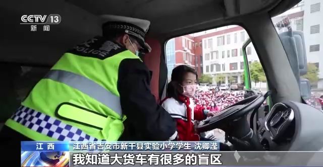 江西省吉安市新干县实验小学学生 沈卿滢:今天是第一次上大货车,我知道大货车有很多的盲区,我们要远离大型货车。