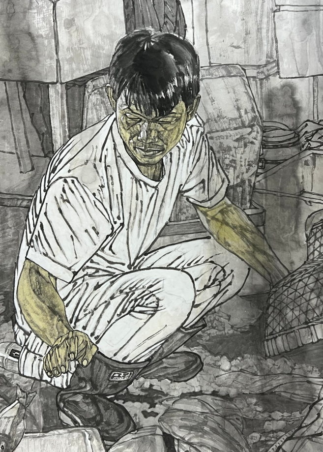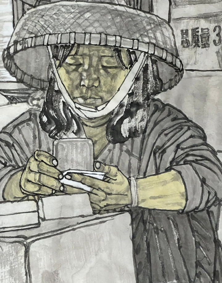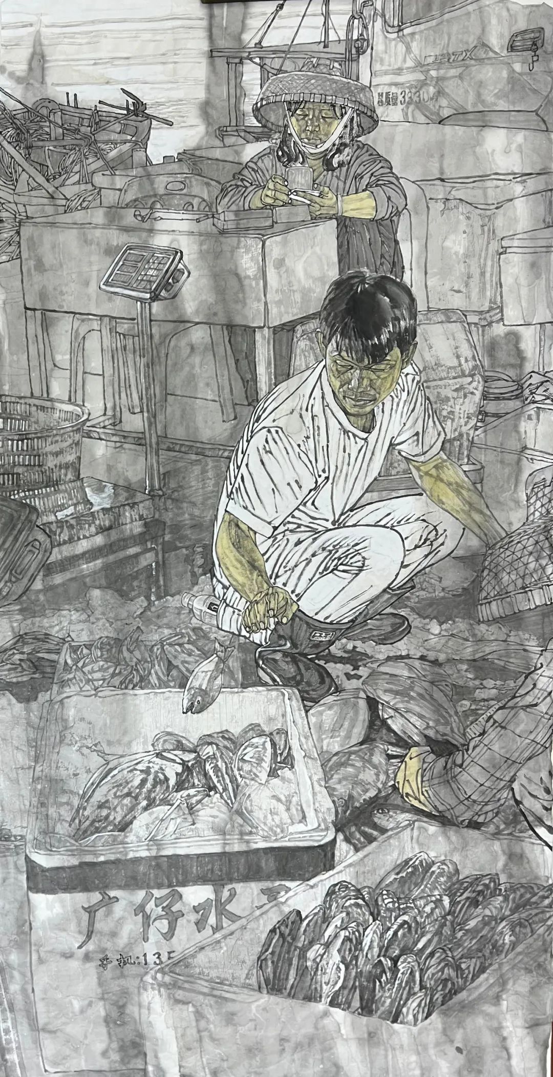 于火热的现实生活中冷静取材,借以表达“为万千基层劳动者写真传神”之宏旨,是马国强艺术的首要特点。海南极富魅力的椰风海韵和黎苗风情,更是给这位著名老画家的人物画创作带来了很多灵感。在繁忙的渔港,渔船穿梭,渔民奔忙,鱼贩云集。一筐筐海鲜刚落地,购买海鲜的人们便围了起来。渔民忙中有序,卸货,过秤,打包,和批发商交接……马国强用画笔定格下其中一个瞬间,描绘了渔港人民辛勤劳作的生活场景,将海南自贸港改革发展成就和人民小康生活凝注于笔端。在创作中,他采用工笔与写意、泼墨与勾勒、传统线描与画面构成相结合的艺术手法,使作品具有明显的中西融合的效果。
