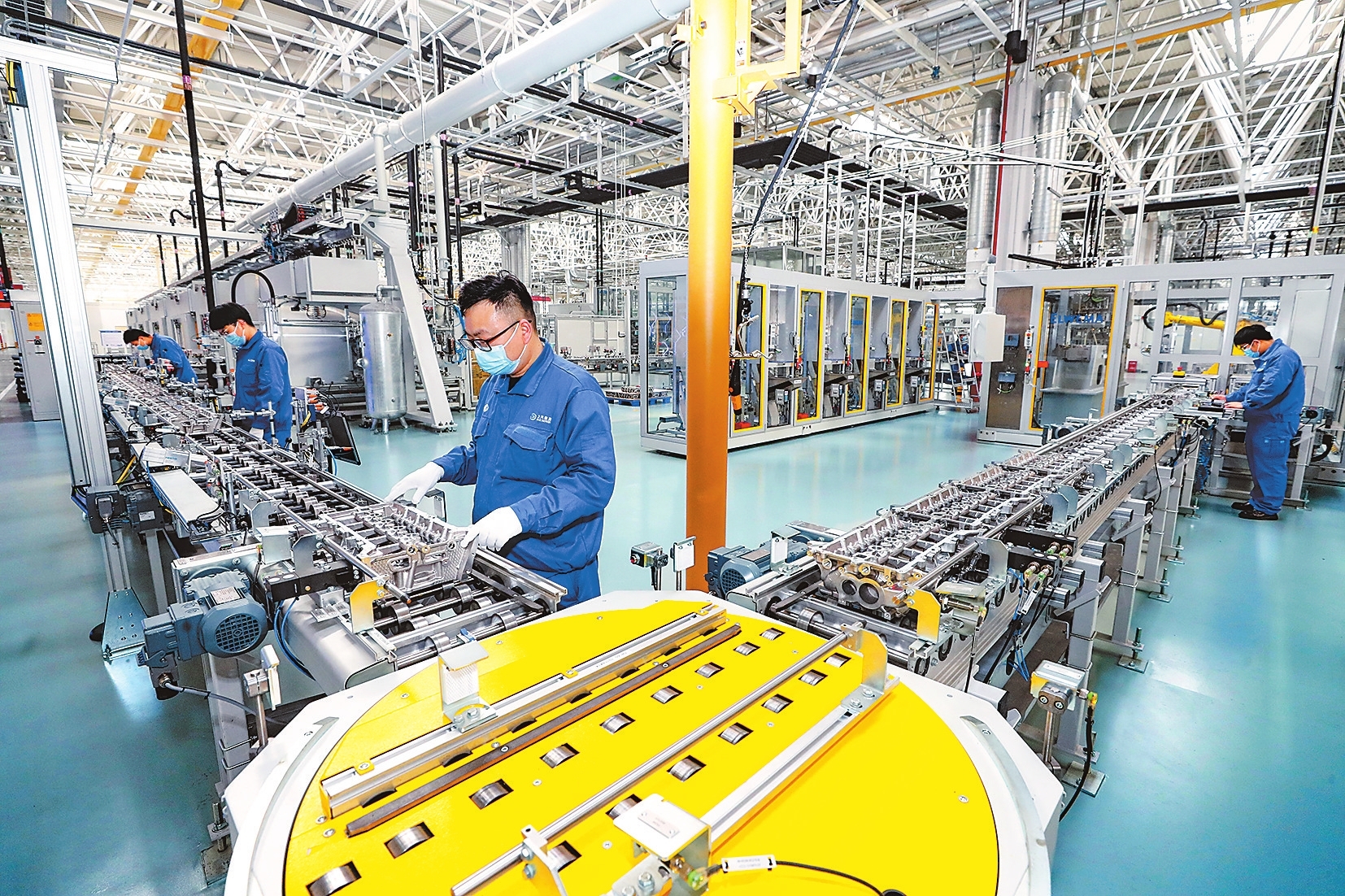 4月6日,上汽集团郑州发动机分公司发动机自动化生产线上,工人在检查产品质量。当日,上汽集团郑州发动机分公司一期30万台项目在郑州经开区正式投产。本报记者聂冬晗 摄