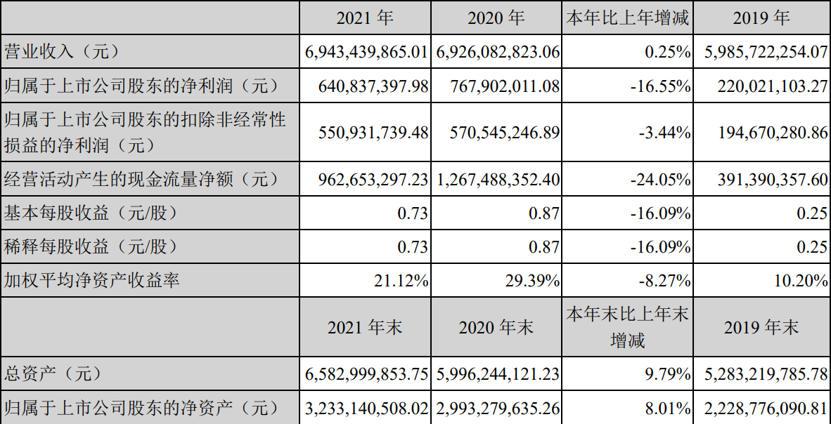 【大河财立方消息】三全食品4月18日发布年报告称,2021年公司实现营业收入约69.43亿元,同比增加0.25%;归属于上市公司股东的净利润约6.41亿元,同比减少16.55%;基本每股收益0.73元,同比减少16.09%。