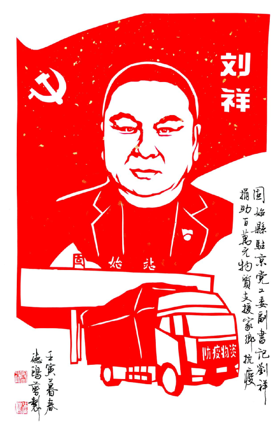 剪纸作品《党旗在疫情防控第一线高高飘扬》,记录了北京宏元益盛建筑工程有限公司经理、固始县驻京流动党员工作委员会副书记、全国“五一劳动奖章”获得者刘祥,闻听家乡遭遇疫情,第一时间行动起来,于2022年4月25日向家乡捐赠100万元的物资,助力家乡抗疫的故事。