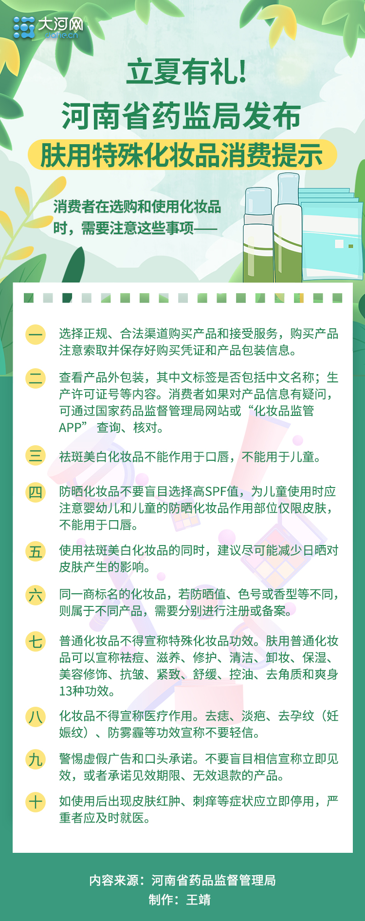大河网讯(记者 王靖)化妆品消费热度持续走高,消费安全不可忽视。5月5日,省药监局发布《肤用特殊化妆品消费提示》,提醒消费者在选购和使用时,若发现不符合要求的产品或怀疑产品质量存在问题,及时向市场监督管理部门反映(投诉举报热线:12315)。