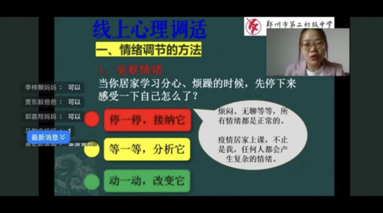 居家学习分心咋解决?郑州市第二初级中学老师分享经验,“当居家学习分心、烦躁时,先停下来,感受一下自己怎么了?停一停,接纳它;等一等,分析它;动一动,改变它。比如听一首歌、做做运动等”。