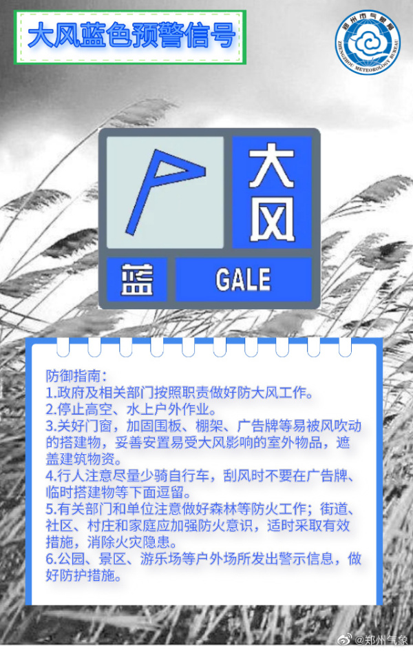 阵风6-7级!郑州发布大风蓝色预警 2022-05-29郑州气象 郑州市气象台2022年05月29日17时30分发布大风蓝色预警信号: 目前郑州市主城区、航空港区、上街区已出现4级偏西风,阵风6-7级,预计今天傍晚至前半夜,上述地区仍有4级以上偏北风,阵风6级左右,请注意防范。 编辑:李瑞