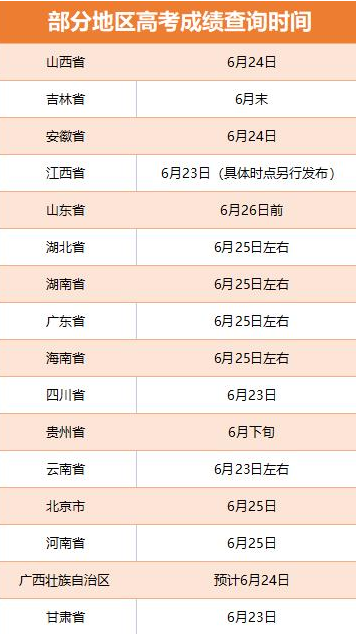 其中,江西、甘肃等省份的查分时间都在6月23日,安徽、山西等地为6月24日,北京、河南等地为6月25日。