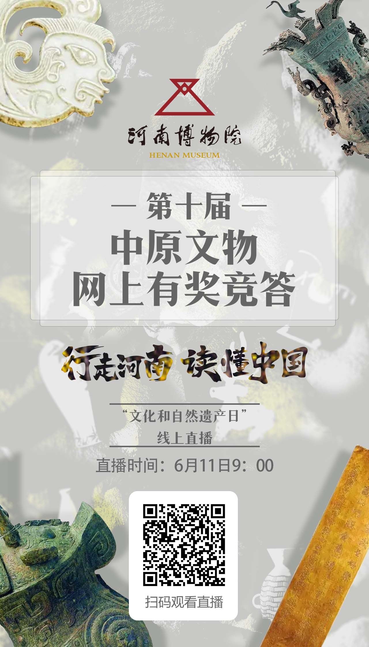 大河网讯 行走河南,读懂中国。6月11日上午,河南博物院第十届中原文物网上有奖竞答暨“行走河南·读懂中国——家乡的国宝”主题活动举行,活动采取线下展厅讲解及线上直播互动的形式,为公众解读文物的保护与发现,讲述河南博物院九大镇院之宝背后的故事,并同时公布第十届中原文物网上有奖竞答第二批获奖名单。