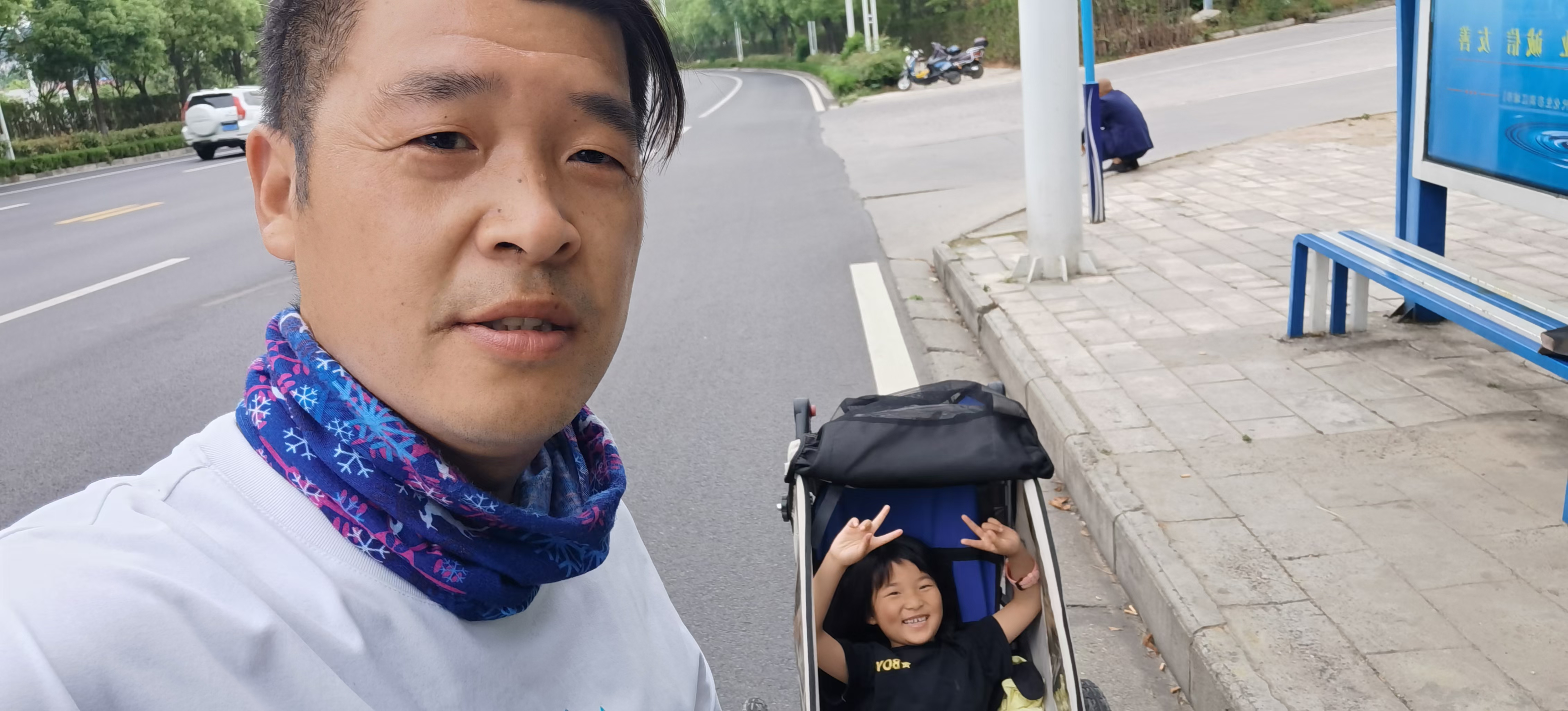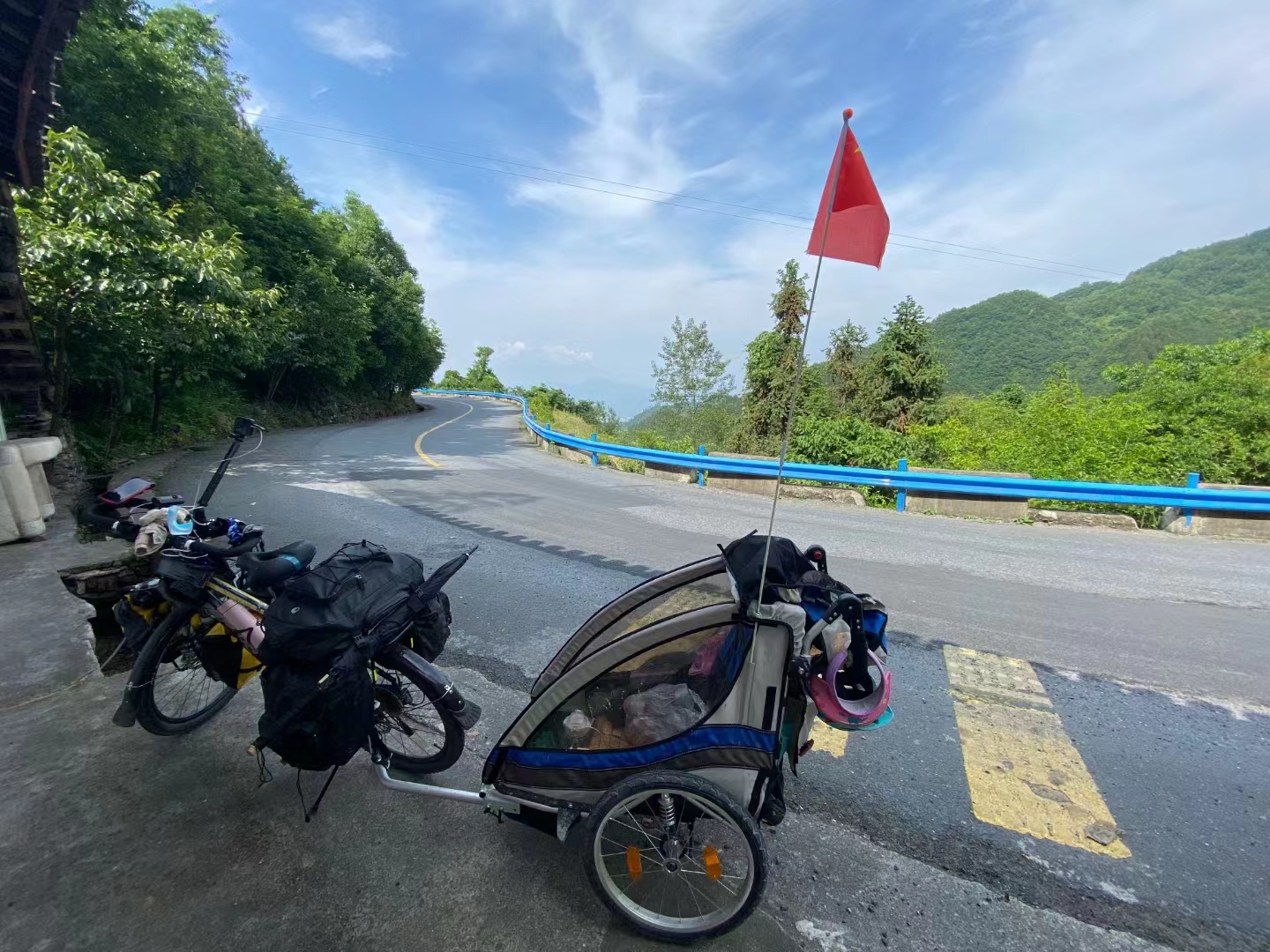 在张付强拍摄的视频里,他骑着自行车,车后面一个特制的小拖车里躺着女儿张二毛。行程中全部的动能都来自张付强的双腿,当然,上坡的时候,张二毛也会下来给老爸加油鼓劲,这也是一种能量。