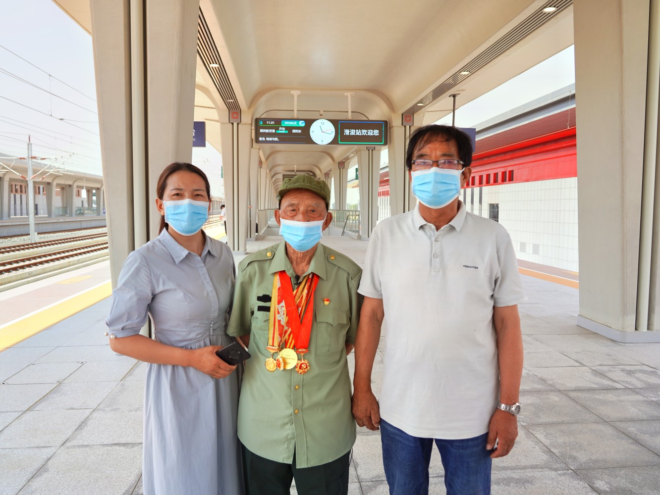 6月20日一大早,常桂林特地嘱咐大儿子常继平和外孙女李翠敏帮他换上军装,挂上了逢出门必佩戴在胸前的那些勋章,一家三代人早早地从滑县老家老庙乡赶到了滑浚站。今天的行程,常桂林非常兴奋。参观站房时,老人指指这儿,望望那儿,开心得像个孩子。