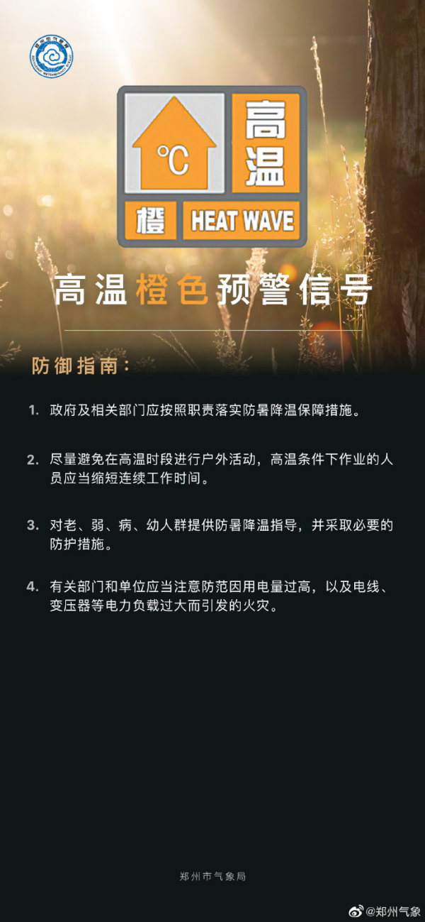 局地37℃以上!郑州发布高温橙色预警信号 2022-06-23@郑州气象 郑州市气象台2022年06月23日09时20分继续发布高温橙色预警信号:预计今天白天郑州市主城区、航空港区、上街区最高气温将升至37℃以上,请注意防范高温天气带来的不利影响。 编辑:王晓颖