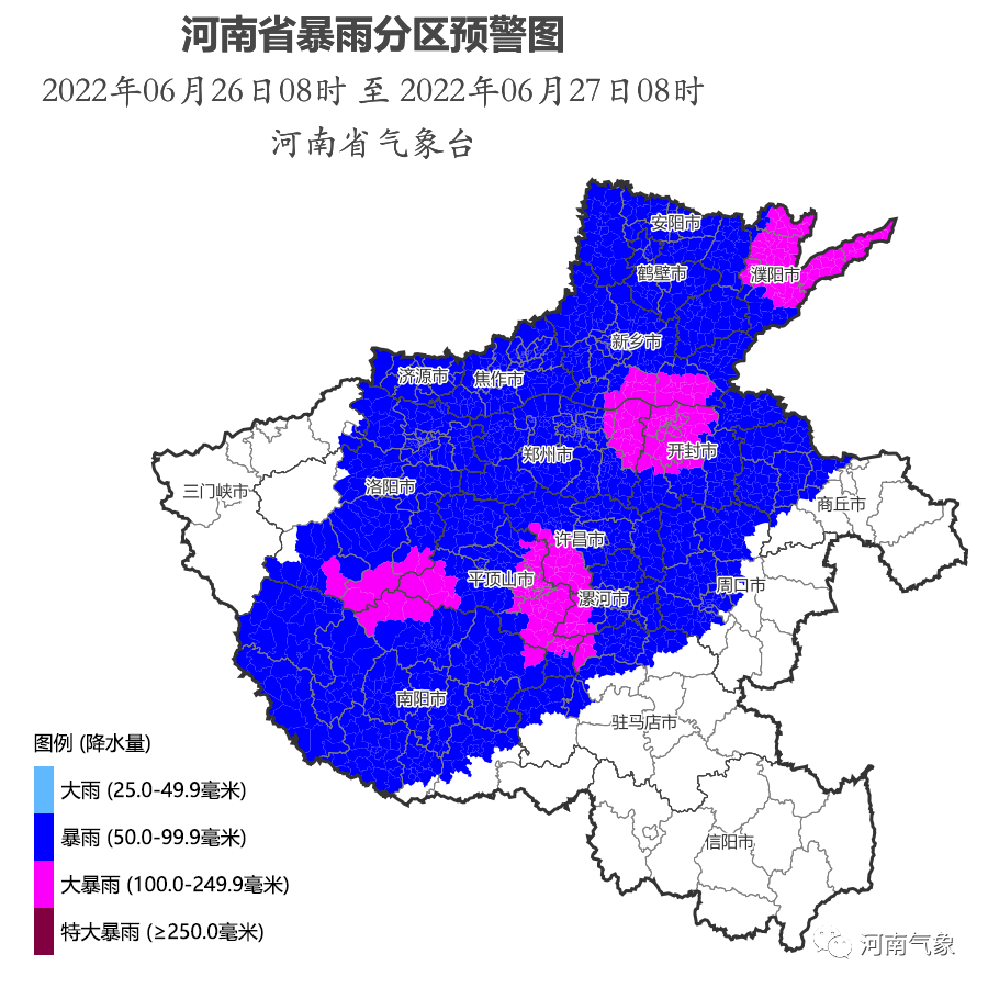 河南省气象台2022年06月25日15时00分发布暴雨蓝色预警:预计06月26日08时00分至27日08时00分,郑州、开封、洛阳、平顶山、安阳、鹤壁、新乡、焦作、濮阳、许昌、漯河、三门峡、南阳、商丘、周口、驻马店、济源将出现50毫米以上降雨,其中郑州、开封、洛阳、平顶山、新乡、濮阳、许昌、漯河、南阳、驻马店部分县市将出现100毫米以上降雨,局部200毫米以上。并伴有雷电、短时强降水、局地雷暴大风、冰雹等强对流天气。请注意防范。