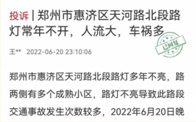 近日,多名群众通过顶端新闻“我想@领导”问政平台反映:郑州市惠济区天河路北段(北四环-312省道段)路灯多年不亮,由于道路两侧有多个成熟小区,因路灯不亮导致该路段交通事故频发。