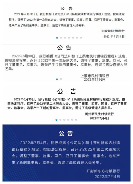 河南4家村镇银行更换董事长、监事长及高管
