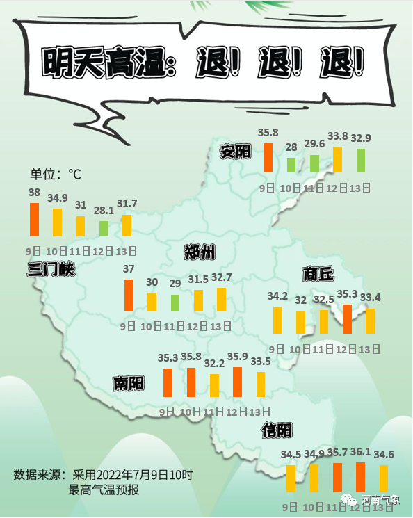 今天傍晚到夜里,全省多云到阴天,安阳、鹤壁、濮阳、新乡东部、开封、商丘、周口、驻马店部分县市有小到中阵雨、雷阵雨,局部大雨并伴有短时强降水、雷暴大风等强对流天气;其他县市有分散性阵雨、雷阵雨。明天-15日