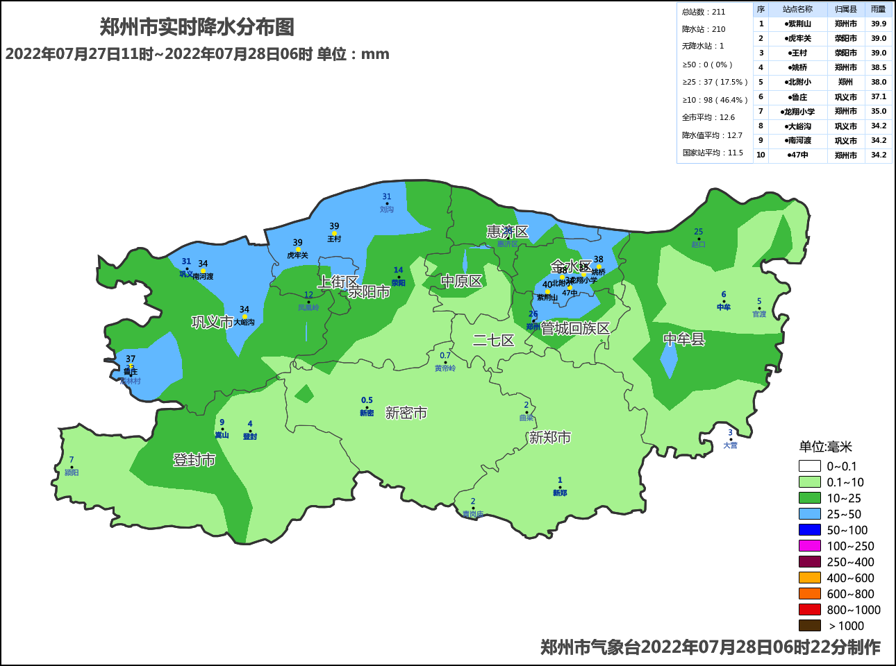 郑州出现中到大雨,并伴有短时强降水、局地雷暴大风等强对流天气,最大降水为27日17-18时在郑州市区紫荆山站的39.7毫米。