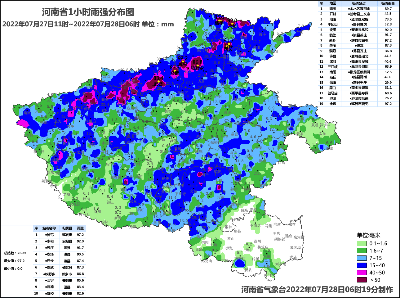 小时雨量强度大。新乡、安阳、鹤壁、焦作、济源、洛阳、驻马店、三门峡、平顶山、南阳、商丘、许昌、开封、漯河、郑州、濮阳、周口、信阳等地有133个县(市、区)共712站小时雨量超过20毫米,其中有90站小时雨量超过50毫米。小时雨量前3站分别为:辉县冀屯97.2毫米、安阳县永和92.0毫米、浚县苏庄91.7毫米。