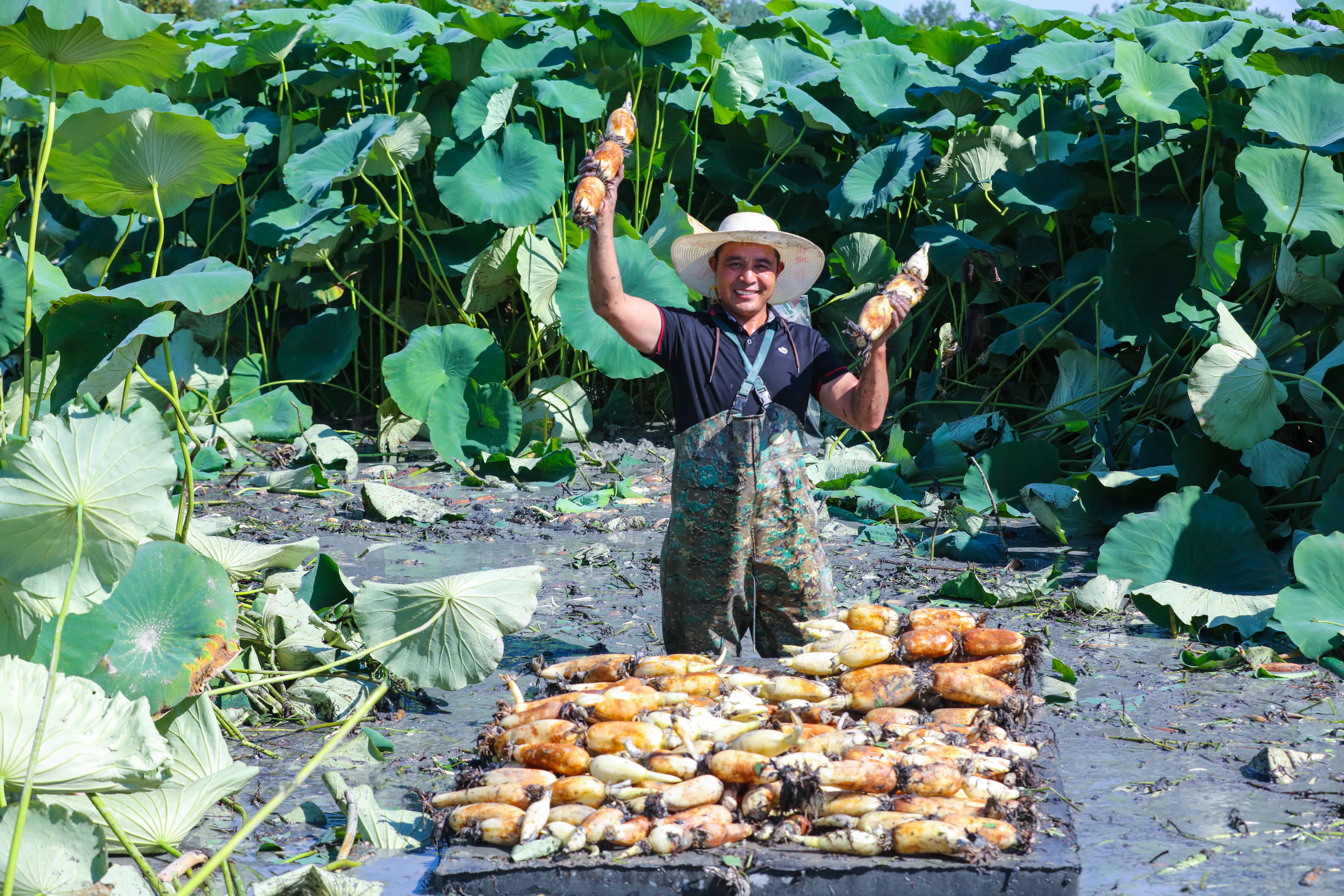 同样的喜人场景,在光山县各个地方不断上演着。今年,该县寨河镇耿寨村引进种植高效品种珍珠莲藕喜获丰收,一排排、一支支白白胖胖的“莲藕”漂浮在水面,让“藕农”一个个脸上乐开了花。据介绍,该品种莲藕平均每亩收入可达5000多元。