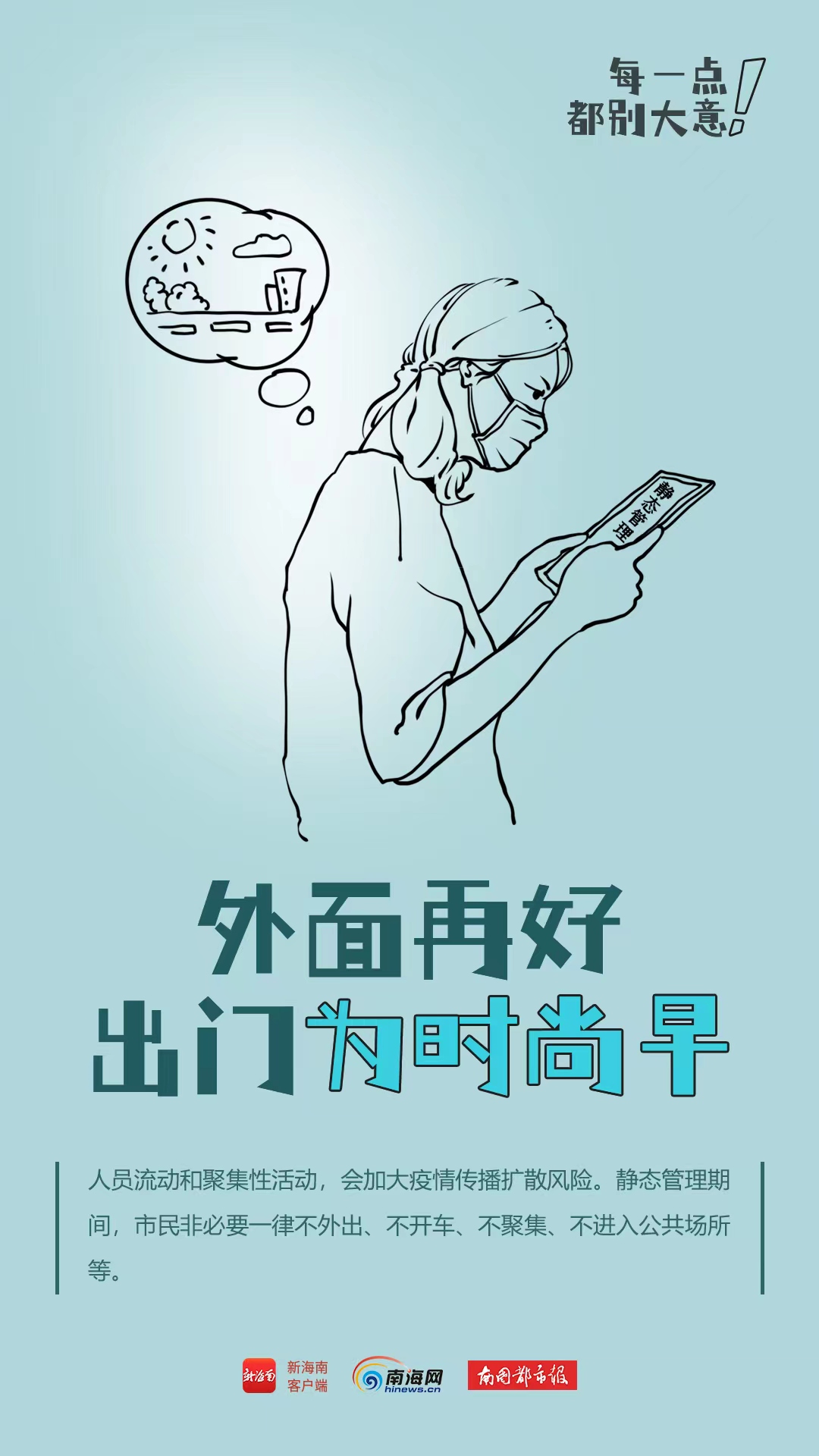 【静态管理,不侥幸!不松劲!这4张防疫海报,每一个提醒都很重要→】奥密克戎变异株传播速度快,传播隐匿,容易引发较大规模聚集性疫情。为有效排除风险隐患,尽快阻断疫情蔓延,当前,海南多地实行临时性全域静态管理。外面再好,出门为时尚早;重点场所,口罩是标配......抗击疫情,每一点都不能大意!你做到位了吗?