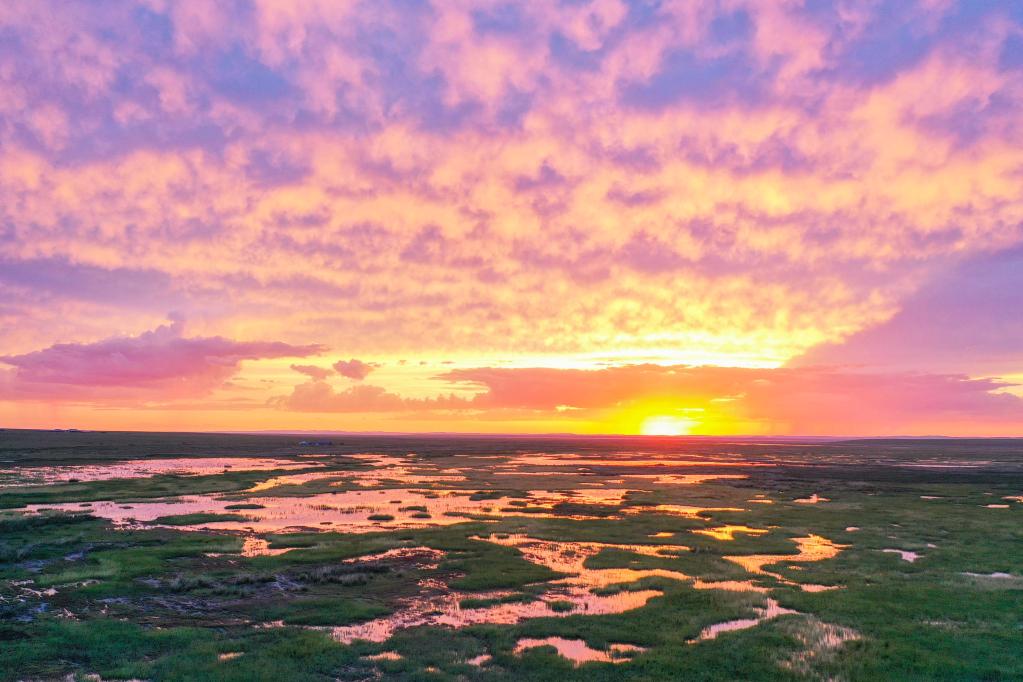这是2022年7月27日在内蒙古东乌珠穆沁旗拍摄的夕阳下的草原(无人机照片)新华社记者 刘磊 摄