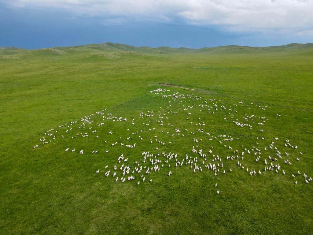 初秋的草原依然葱郁,在内蒙古自治区锡林郭勒盟东乌珠穆沁旗额吉淖尔镇,52岁的哈斯巴雅尔一大早就骑上摩托车,把羊群从棚圈缓缓赶到草场。羊儿停下脚步吃草,他便席地而坐,望向远方。“草的长势一年比一年好,绿得让人心情舒畅。”他说。