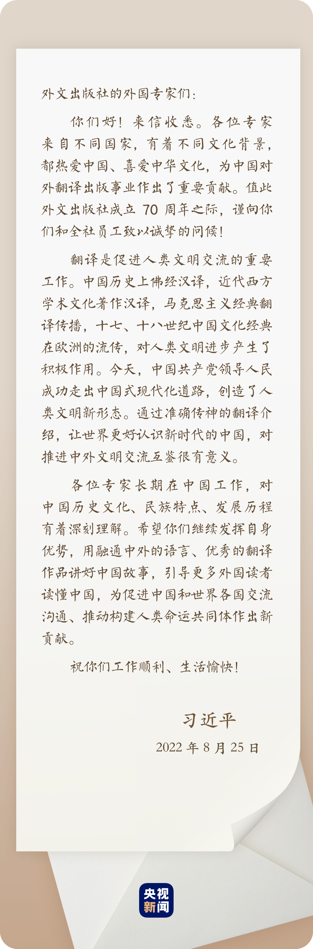 近日,外文出版社的5名外国专家给习近平主席写信,讲述了参与翻译出版《习近平谈治国理政》等图书的深切感受,表达了从事让世界读懂中国工作的自豪心情。